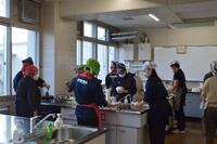 理科と英語科のコラボ授業では、燃焼に関する英語クイズでグループごとに対戦して盛り上がり、その後に燃焼・爆発の実験を行い、燃焼のメカニズムについて理解を深めました。授業では、英語と化学を関連づけることで物質の英語名と元素記号の関係性も理解できました。地歴公民科と数学科のコラボ授業では、避難袋の重要性や中身について意見を交わし、隙間なく袋に物を詰めるしくみについて数学的な視点で理解を深めました。その他、地歴公民科と芸術科のコラボ授業では防災に関わるピクトグラムの作成、家庭科では防災食の食べ比べ、情報科では災害時の情報の信頼性を確かめる「情報防災訓練」を行うなど、1週間を通して防災について深く学習し、防災に対する意識の向上を図りました。